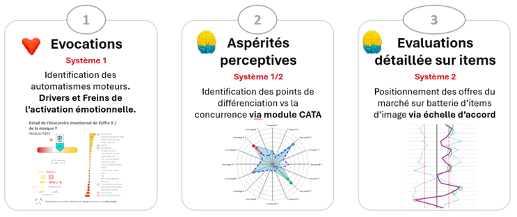 Pour aller au‑delà des raisons de choix / non‑choix et identifier les perceptions induites par votre offre vs vos concurrents, nous recommandons de combiner plusieurs niveaux d'évaluation, inspirés des deux systèmes de pensée décrits par Kahneman (système 1 : rapide, intuitif, émotionnel / système 2 : lent, analytique, rationnel)