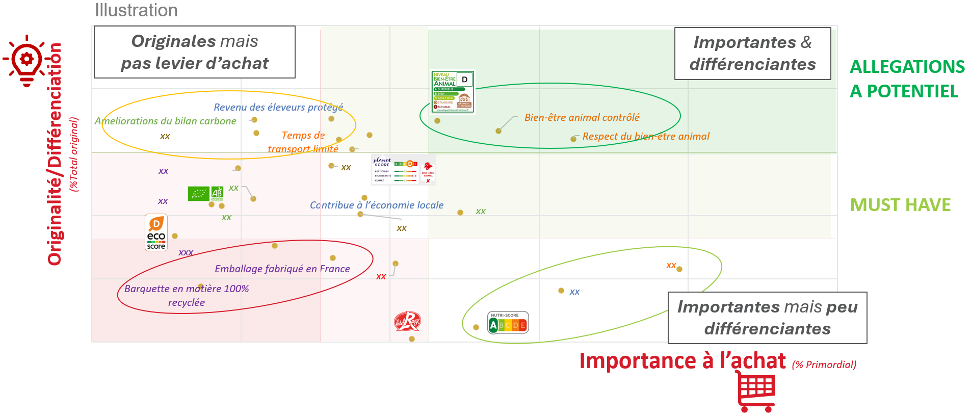L'analyse croisée de ces différentes dimensions permet de mieux comprendre le potentiel de chaque allégation et d'identifier par exemple les allégations prioritaires (fortes & différenciantes), les « must‑have » (importantes mais banalisées), des allégations plus originales mais à potentiel limité.