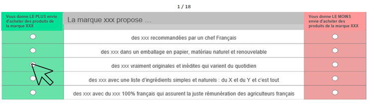 La méthode MaxDiff repose sur des choix simples et répétés : à chaque fois, le répondant identifie la formulation qu'il préfère le plus et celle qu'il préfère le moins parmi une sélection de 5 choix. Répétée une quinzaine de fois, cette approche permet de classer un grand nombre de propositions et d'obtenir un ranking précis
